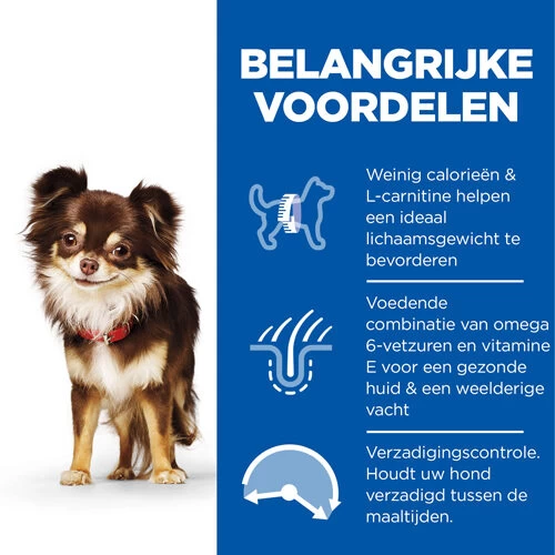 Deze lijn is speciaal ontwikkeld omdat 42% van de hondenpopulatie tot de kleine rassen behoort. Hill’s Science Plan Adult Small & Miniature Light helpt kleine hondenrassen het ideaalgewicht te behouden en ondersteund de gezondheid van mond en gebit. Daarnaast bevat dit hondenvoer van Hill’s L-Carnitine. Dit draagt bij aan een gezonde werking van het hart van uw hond!