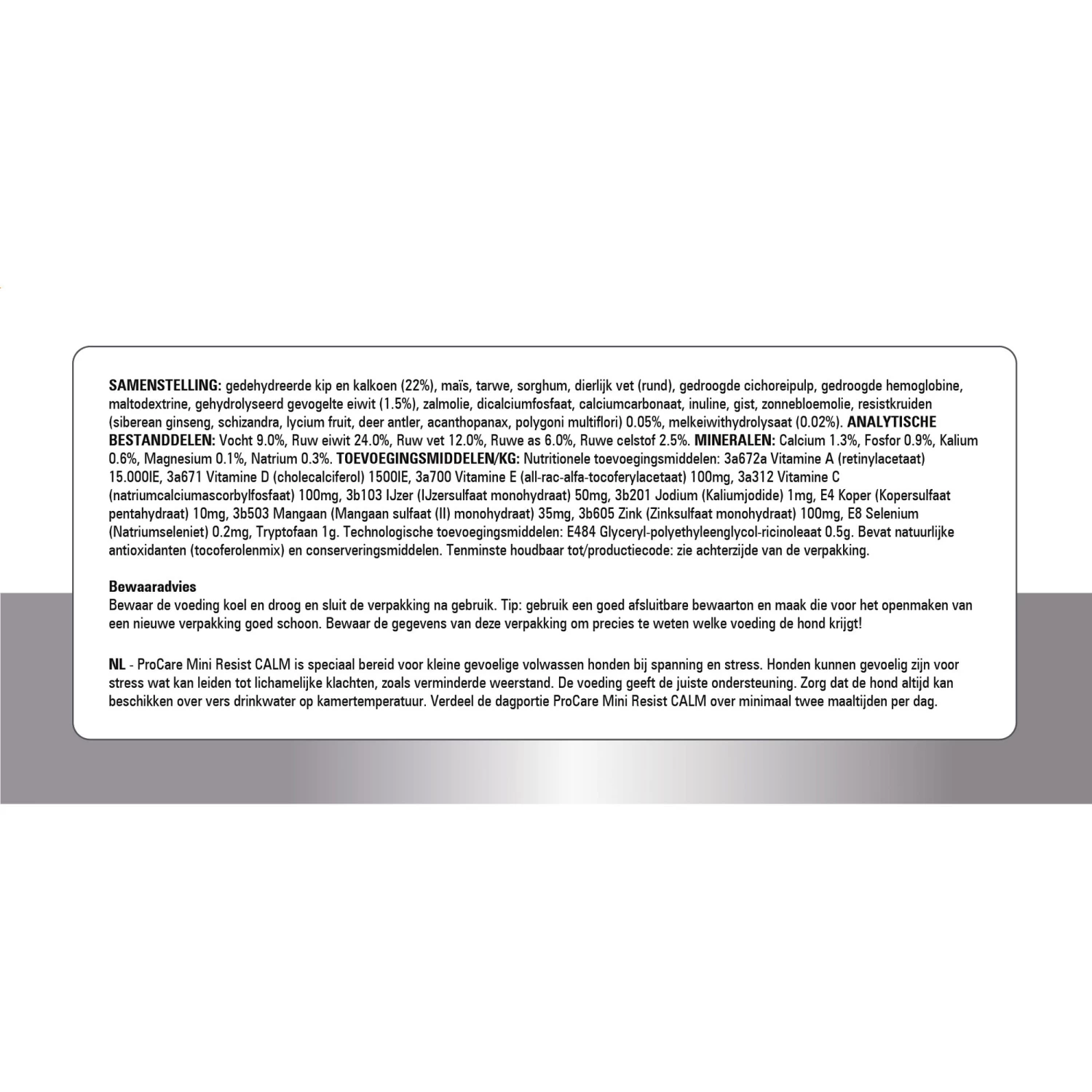 Honden die een verminderde weerstand hebben, kunnen met de ProCare Mini Resist Calm van Prins ondersteund worden. Deze voeding is geschikt voor honden van een klein ras die een verminderde weerstand hebben door ziekte, herstel na operatie, spanningen of hormonale schommelingen. De ProCare Mini Resist Calm ondersteunt het immuunsysteem, door het gebruik van kruidenextracten, vitaminen en mineralen, waaronder vitamine D, zink en selenium. De omega 3-vetzuren in het voer dragen bij aan een betere conditie van de gevoelige huid en zorgen voor een glanzende vacht. Als uw hond veel last heeft van spanningen, kan dat zorgen voor lichamelijke klachten en een verminderde weerstand. De ingrediënten zalmolie, FOS en kruidenextracten geven dan de juiste ondersteuning.