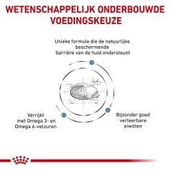 Dieetvoeding kan bij alle huidaandoeningen een belangrijke bijdrage leveren aan het verminderen van de symptomen en het bevorderen van het herstel van huid en vacht. Het nieuwe Skin Care Diet speelt in op dit brede indicatiegebied. De speciale combinatie van omega 3 en 6-vetzuren versterkt het afweersysteem van de huid en beperkt huidreacties. Daarnaast zorgt het Skin Barrier complex voor versterking van de huidbarrière. Hiermee biedt Royal Canin Skin Care de optimale dieetondersteuning bij atopie en andere dermatosen.