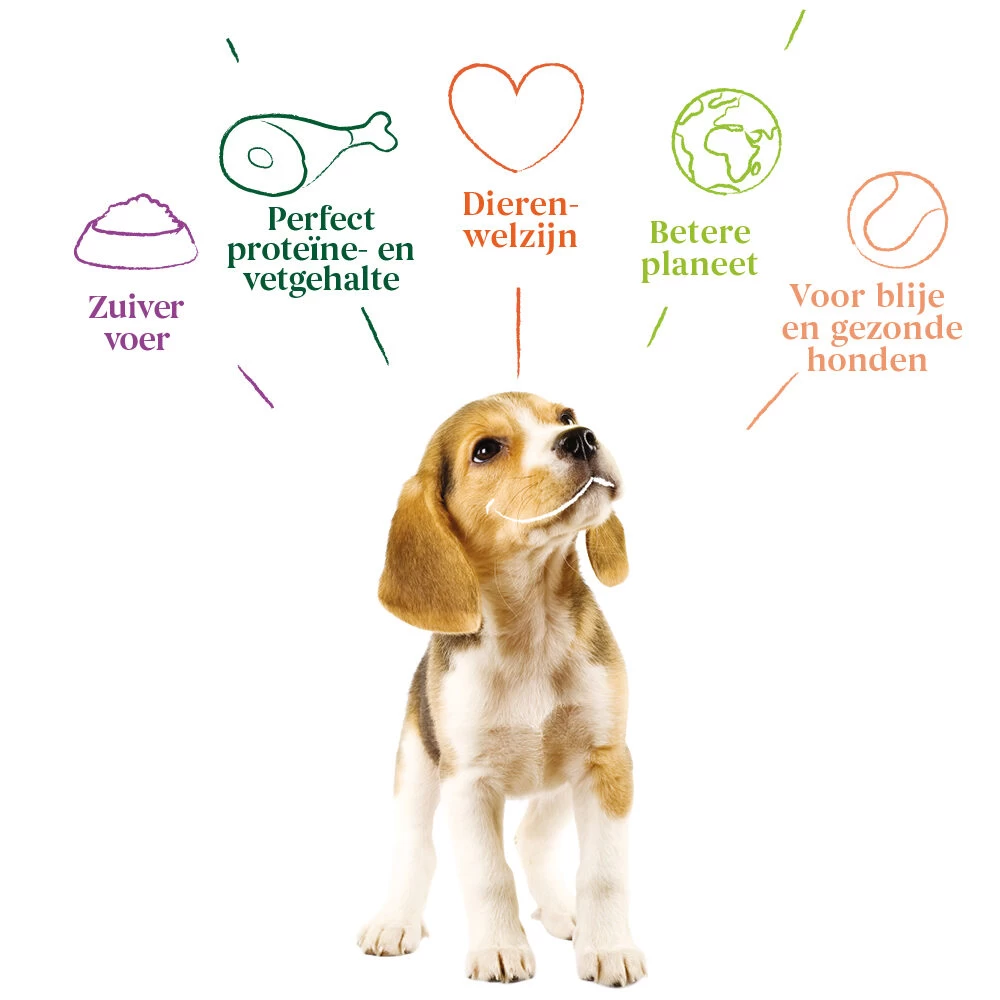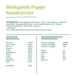 Biologische gedroogde kip (22%), biologische volkoren haver, biologische gele mais, biologische volkoren tarwe, biologische kippenvet (bron van energie en essentiΓ«le vetzuren), biologische sojaschilfers (bron van vezels), gedroogde wilde haring (2%) (MSCΒΉ) (bron van omega 3&6 en essentiΓ«le vetzuren), biologische erwten, biologische gehydrolyseerde lever, biologische zonnebloempitschilfers (bron van vezels), mineralen, biergist(bron van hoogwaardige eiwitten en essentiΓ«le aminozuren).