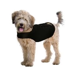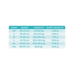 U trekt het shirt over de kop en voorpoten en langs de rug. U wikkelt de borstriem om het lichaam en maakt het vast met klittenband. De nekriem wikkelt u om en maakt u ook vast met klittenband.